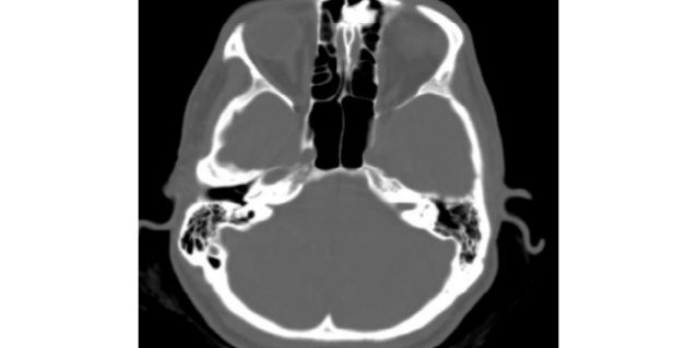 Pacientia 48 vjec diagnostikohet pas nje egzaminimi Ro-grafik te sinuseve paranasale pasi paraqiste nje dhimbje te vazhduar te kokes dhe prej disa vitesh trajtohej me medikamente te ndryshem pa efikasitet. Per saktesim diagnoze u be CT i kokes dhe u pa qarte madhesia dhe shtrirja e osteomes e cila e merrte orgjinen nga septum intrasinusal i sinusit frontal dhe shtrihej brenda kufijve te sinusit. Interventi kirurgjikal per heqien e saj u realizua me incision fronto-orbital[Lothrop].